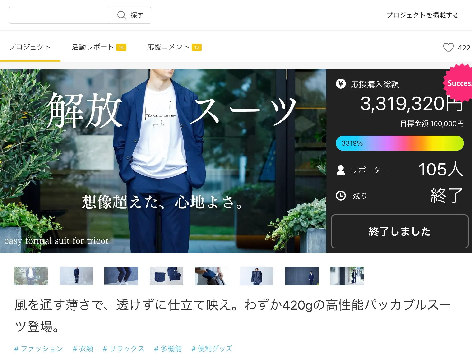 実際に現地を訪れ、「tococie」の生地が生まれる製造過程を見学させていただきました。ブランドの思いやテーマを深くヒアリングし、上質で普遍的な世界観を表現することに注力。商品の魅力を視覚的に伝えるため、好感度の高いモデルを起用し、運転や出張などリアルな着用シーンを撮影しました。消費者が商品を身近に感じ、具体的な使用シーンを想像しやすくしました。また、ビジュアル面ではスタイリッシュさを追い求めつつ、過度なファッション性に偏らないよう細心の注意を払い、幅広い層に訴求できるバランスを維持しました。特にパッカブルな形状、420gの軽量、通気性、デザイン性などの特徴を明確に伝え、動きやすさや速乾性を動画やGIFで表現。これにより、商品の機能性と着心地の良さを実感できる形で伝えることができ、生産限定数を完売。プロジェクトは3319%の達成率と3,319,320円の売上を達成しました。